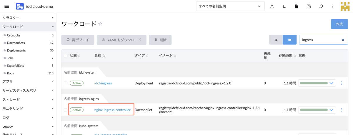 イングレスプロバイダーを有効にするとSystem上で nginx-ingress-controller がActiveとなります。