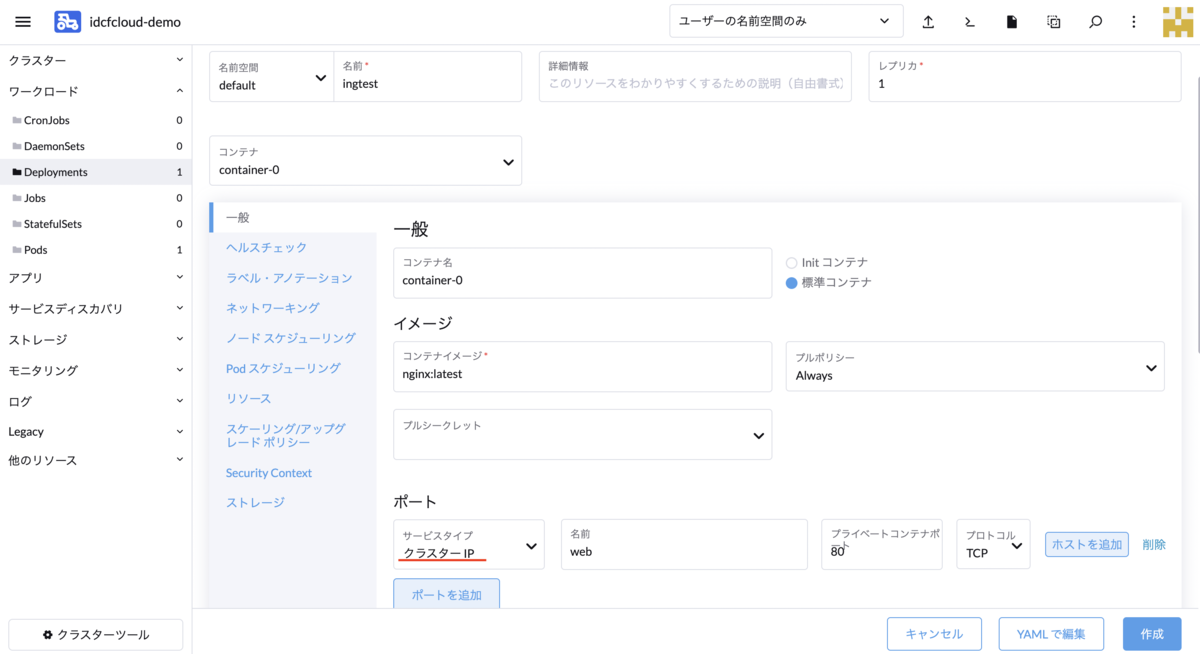 では、次に分散先となるワークロードを準備します。ここでの例では、WEBサーバーとしてnginxのワークロードをデプロイしておきます。この時、ポートの設定として「クラスターIP」を指定しておきます。