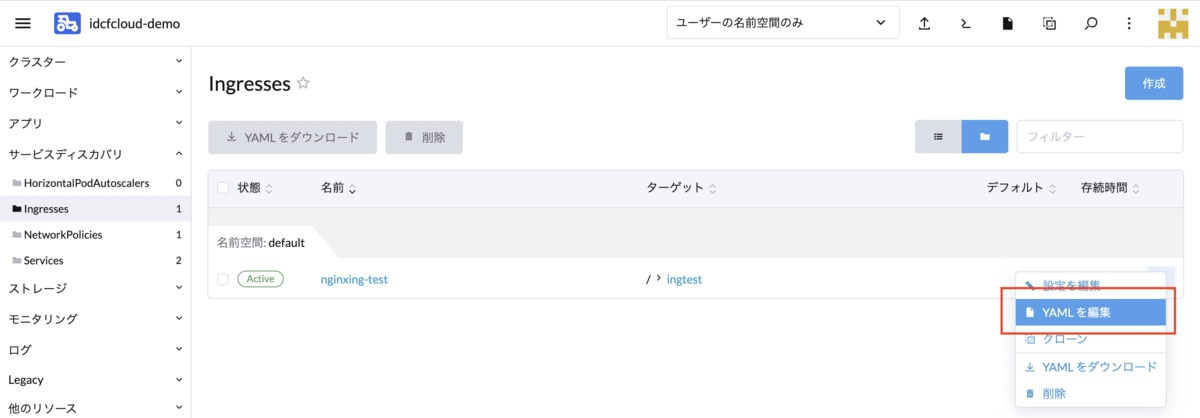 また動作として現状必須ではありませんが、ingressClassNameもデフォルトではインフィニットLBが設定されるため、NGINX Ingressを指定しておくのが安全です。「YAMLを編集」から spec の下に